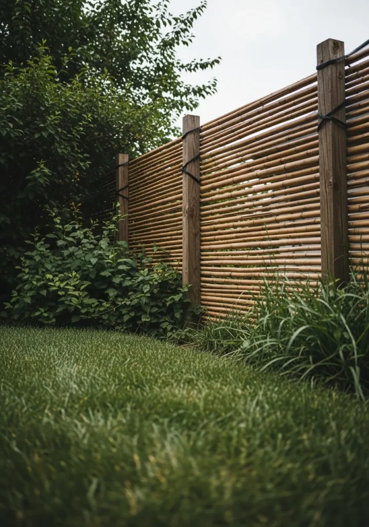 Horizontal Bamboo Slat Fence Along a Green Lawn