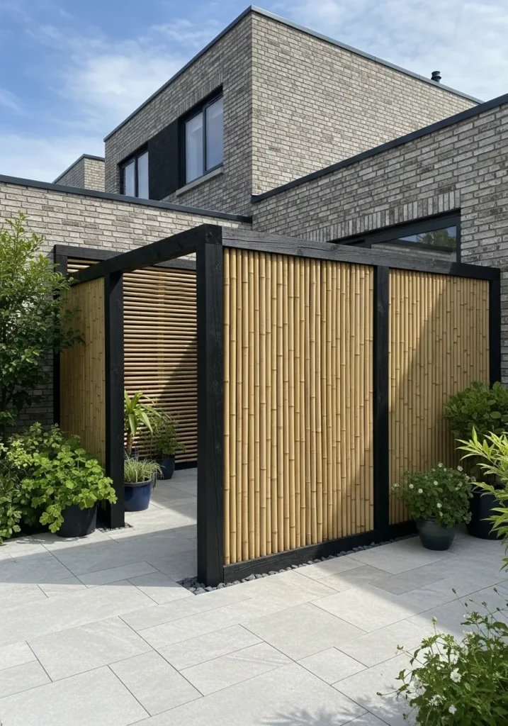 This design features sleek bamboo panels set inside dark metal frames, forming a structured privacy wall beside a contemporary home. The vertical bamboo slats bring warmth to the cool stone and concrete surfaces around them. Clean lines and sharp angles give the whole area a polished look, while potted greenery softens the edges and adds a natural touch. The contrast between the modern architecture and organic bamboo is striking yet balanced.