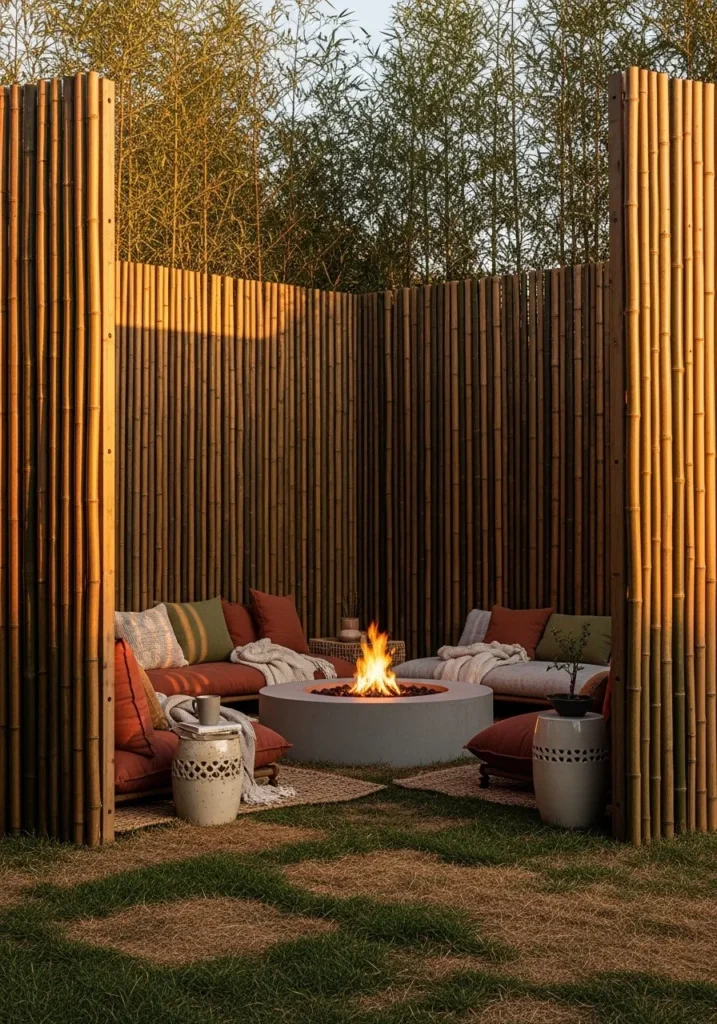 Here, tall bamboo screens rise up around a circular fire pit area, creating an intimate outdoor room. The vertical poles vary slightly in tone, which adds depth and visual interest. Low outdoor sofas with neutral cushions surround the fire, and the bamboo walls make the space feel sheltered without being heavy. Warm light from the fire reflects gently off the bamboo, enhancing its golden hue.