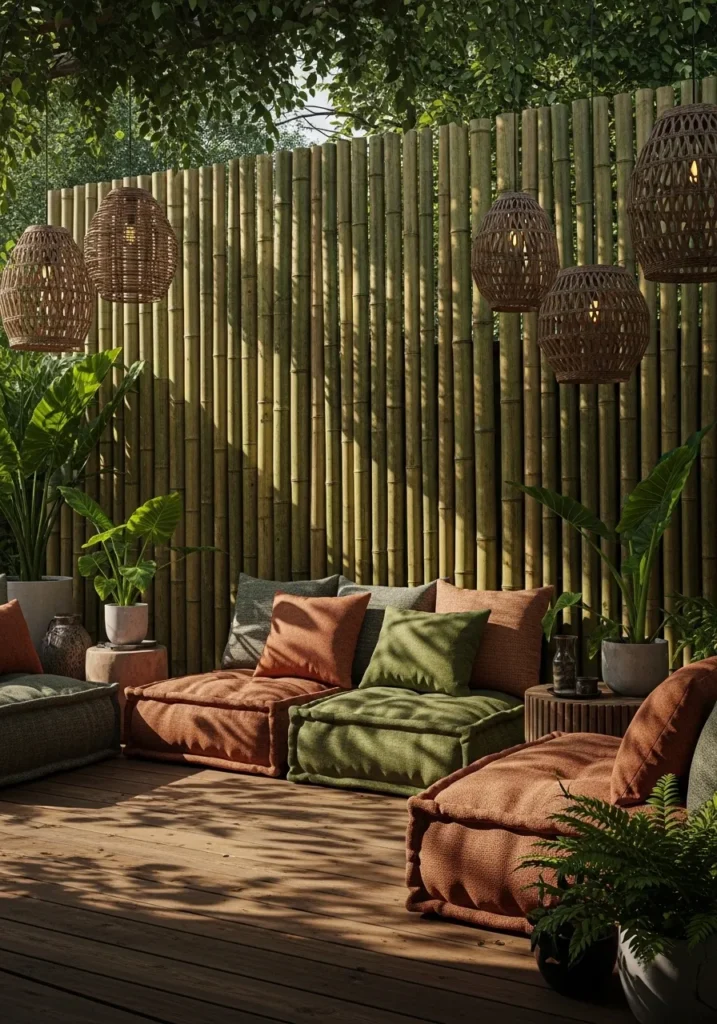 This design showcases vertical bamboo slats set behind a low wooden deck lounge area. Plush cushions in earthy greens and warm browns are arranged casually on the floor, creating a laid back seating zone. Woven lanterns hang nearby, casting gentle shadows across the bamboo surface. The natural materials work together to create a relaxed and organic atmosphere.