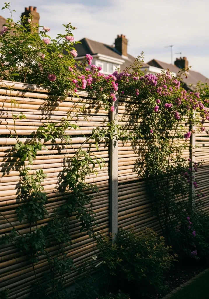 I love how the flowers completely transform the look of the fence. The bamboo gives structure and privacy, but the climbing vines bring romance and softness. It feels alive and evolving, which makes the whole garden feel more personal. This kind of design always makes me smile because it blends practicality with natural beauty so effortlessly.