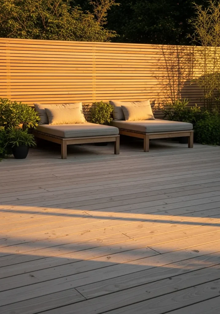 This bamboo privacy screen features sleek horizontal slats that stretch across the back of a spacious wooden deck. The lines feel clean and architectural, yet the natural bamboo texture softens the overall look. In front of the screen, simple lounge chairs with neutral cushions create a relaxed outdoor seating area. Golden evening light washes over the bamboo, highlighting its subtle grain and warm tone.