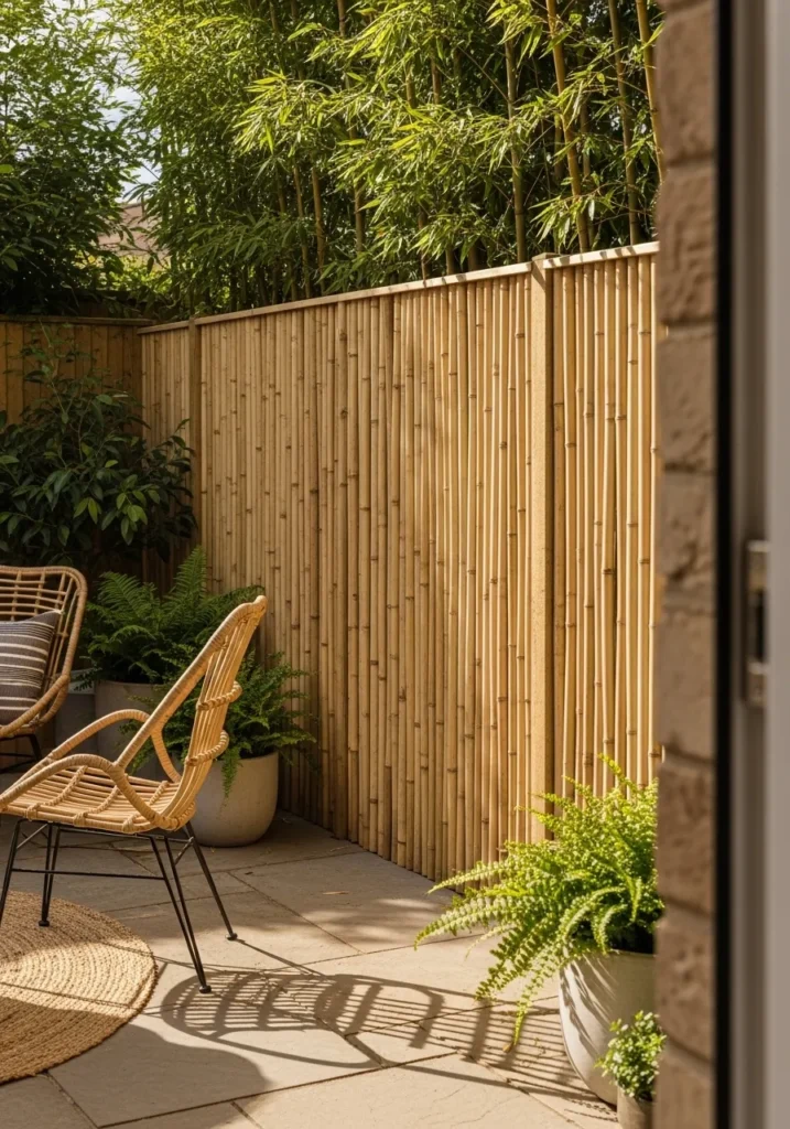 This design features a tall bamboo privacy fence wrapping around a small patio corner. The slim vertical slats form a clean and continuous surface, adding height and privacy without making the space feel heavy. A pair of woven rattan chairs and a round jute rug soften the structured lines of the fence. Potted plants at different heights add movement and texture against the warm bamboo backdrop.