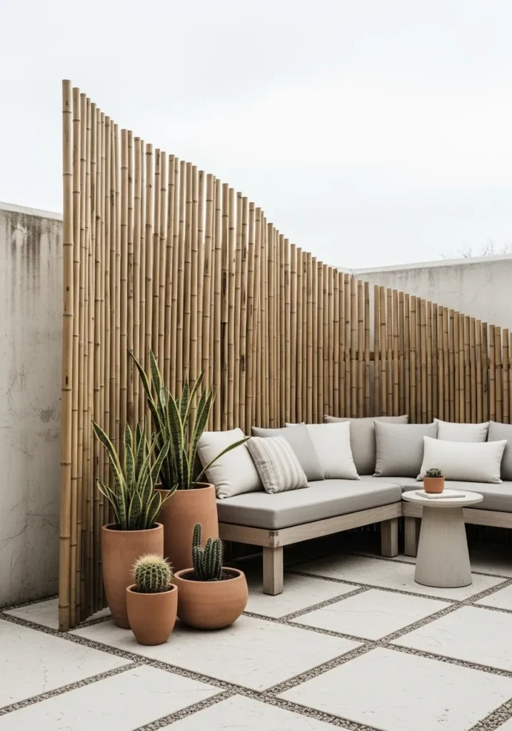 Here, bamboo panels are set within structured frames, forming a sleek and modern privacy wall. The bamboo is neatly aligned and evenly spaced, giving the design a polished yet still organic look. In front, plush outdoor sofas in soft beige tones create a comfortable lounge zone. Late afternoon light highlights the vertical texture and adds depth to the entire setting.