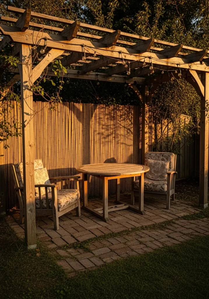 Here, bamboo privacy panels are paired with a wooden pergola structure, forming a sheltered dining nook in the garden. The bamboo lines the back and sides, while climbing plants weave through the overhead beams. A simple wooden table and chairs sit beneath, surrounded by warm evening light. The bamboo adds depth and texture behind the seating area without overpowering the rustic wood tones.