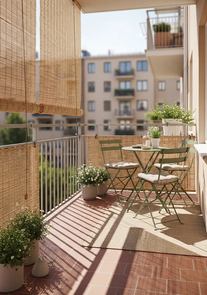 This balcony design uses woven bamboo roll down screens attached to the railing and ceiling. When lowered, they create a semi private cocoon that filters sunlight into a soft golden glow. A small bistro table and folding chairs sit on terracotta tiles, surrounded by potted plants. The bamboo texture feels light and breathable rather than heavy.