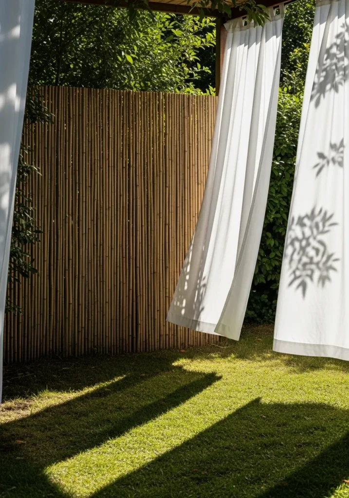 I absolutely love how the curtains soften the strength of the bamboo. It feels romantic without being over the top. The movement of the fabric adds life and makes the yard feel like a private resort corner. For me, this design is perfect when you want privacy but still crave light and softness.