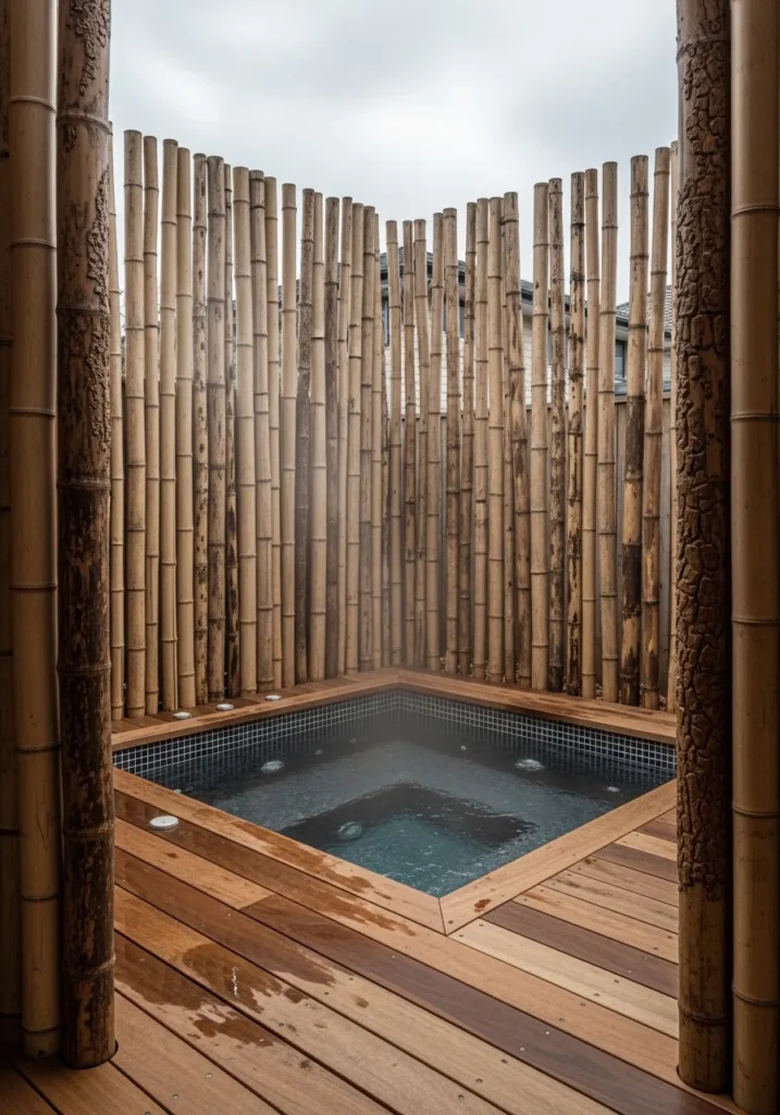 I think this setup feels incredibly peaceful. It turns a simple spa into a private retreat. The bamboo blocks out distractions and makes the focus all about relaxation. I can easily imagine unwinding here at the end of a long day, surrounded by natural textures and quiet warmth.