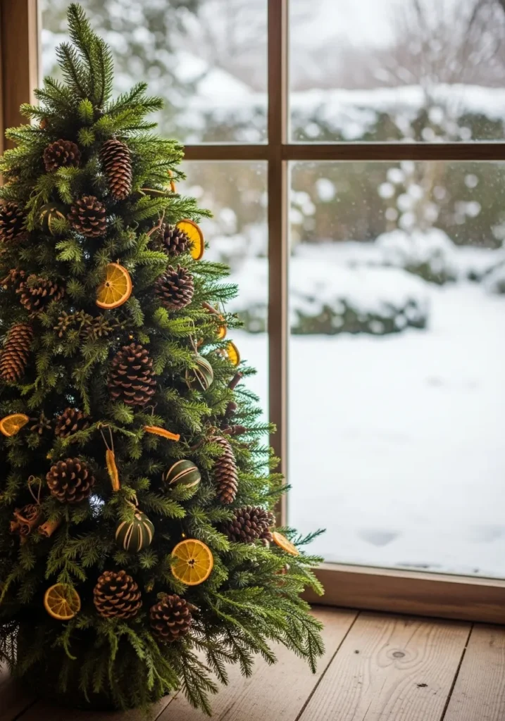 This Christmas tree brings all the cozy woodland vibes indoors with its mix of pinecones, dried orange slices, and natural greenery. The simple setup near a frosty window makes it feel like the forest and the holidays decided to meet for coffee. The wooden floors add an earthy warmth that makes the whole space glow softly against the snowy backdrop.