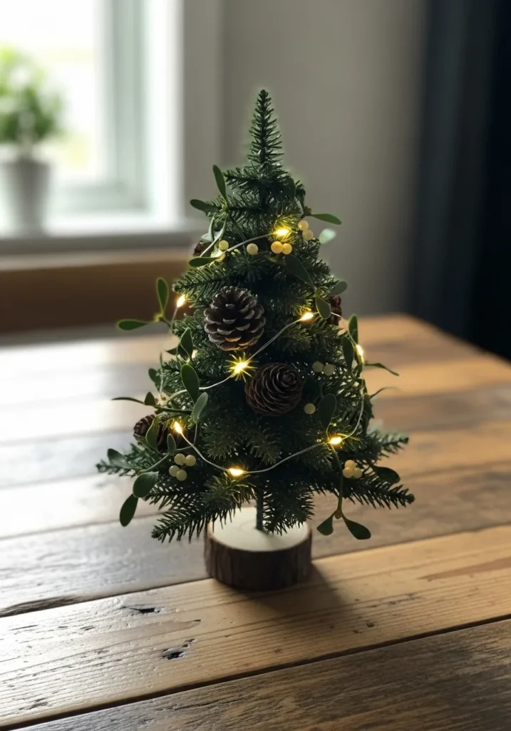 This small tabletop tree proves that size doesn’t matter when it comes to Christmas charm. With its pinecone accents, soft fairy lights, and a wooden base slice, it brings a woodland touch to even the tiniest space. The natural wood table underneath enhances the rustic beauty perfectly.