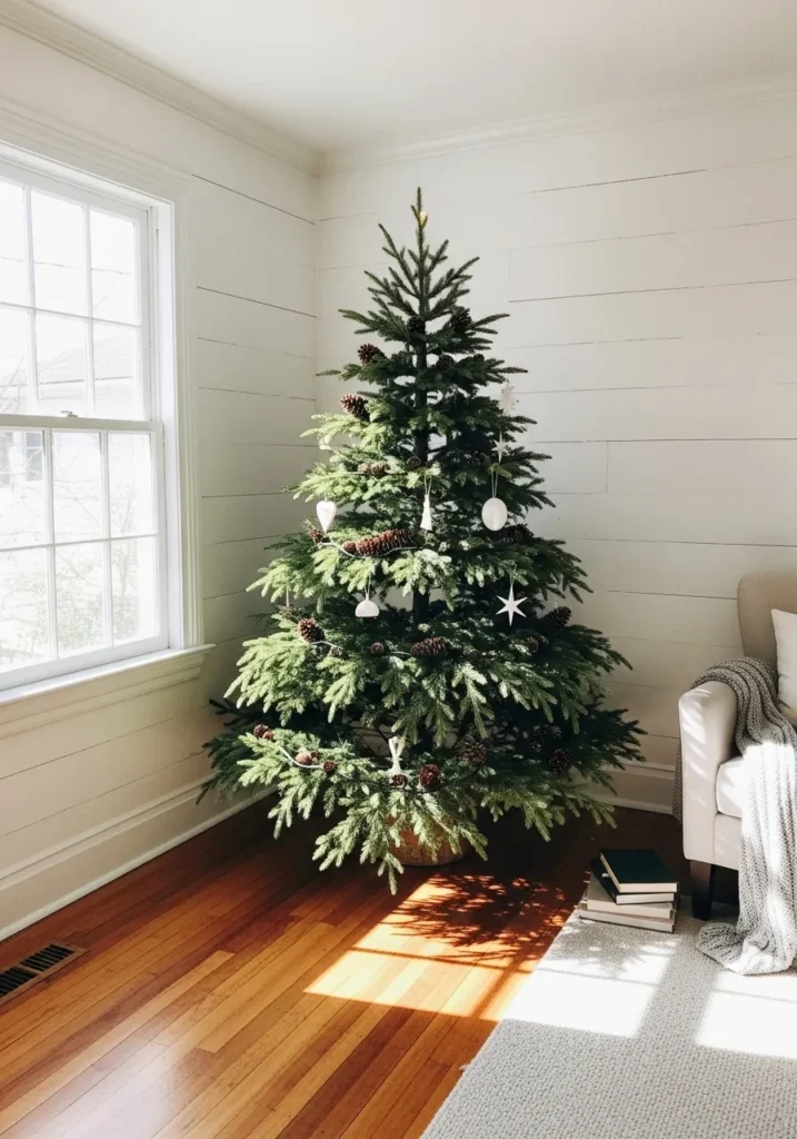Soft sunlight pours over this airy Scandinavian-inspired tree, decorated with pinecones and minimal white ornaments. The white shiplap walls and wooden floors make the green branches stand out in such a soothing way. Everything feels clean, fresh, and quietly festive.