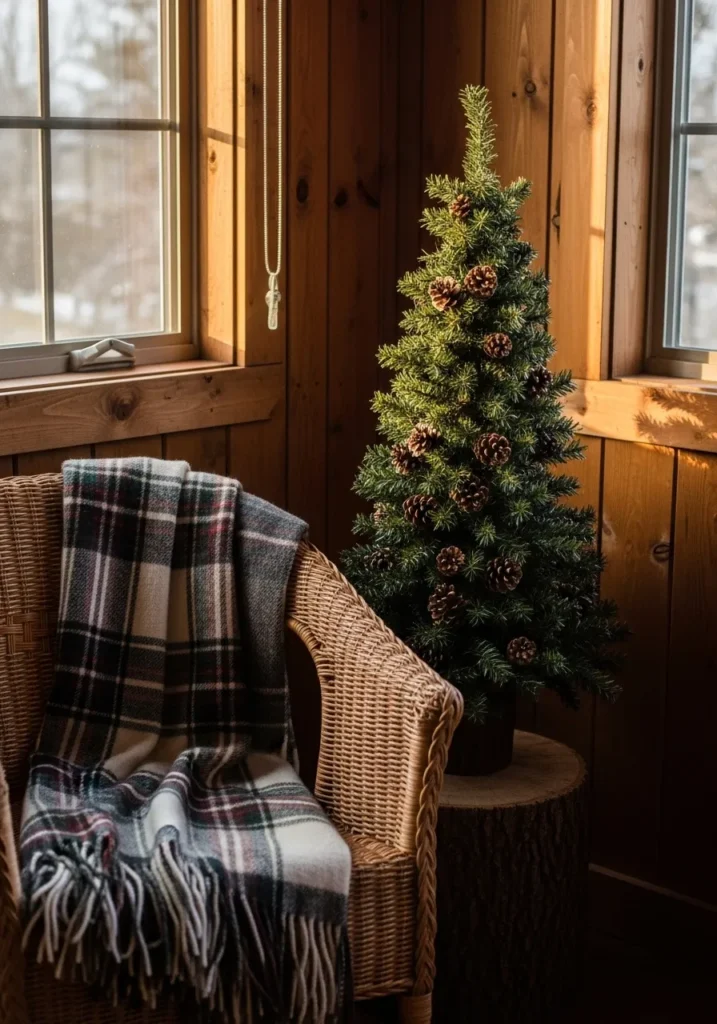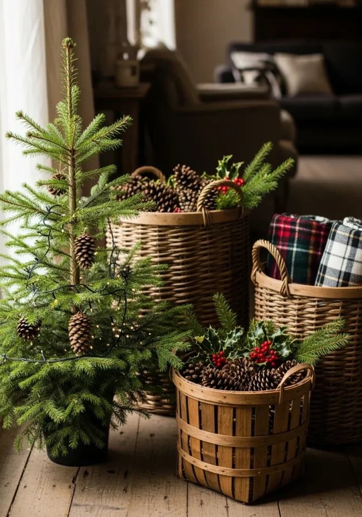 This small pine tree pairs beautifully with baskets full of pinecones, holly, and plaid blankets. The woven textures and earthy tones create a charming woodland corner that feels full of life and warmth.