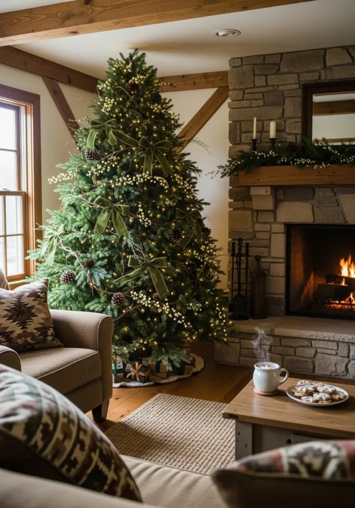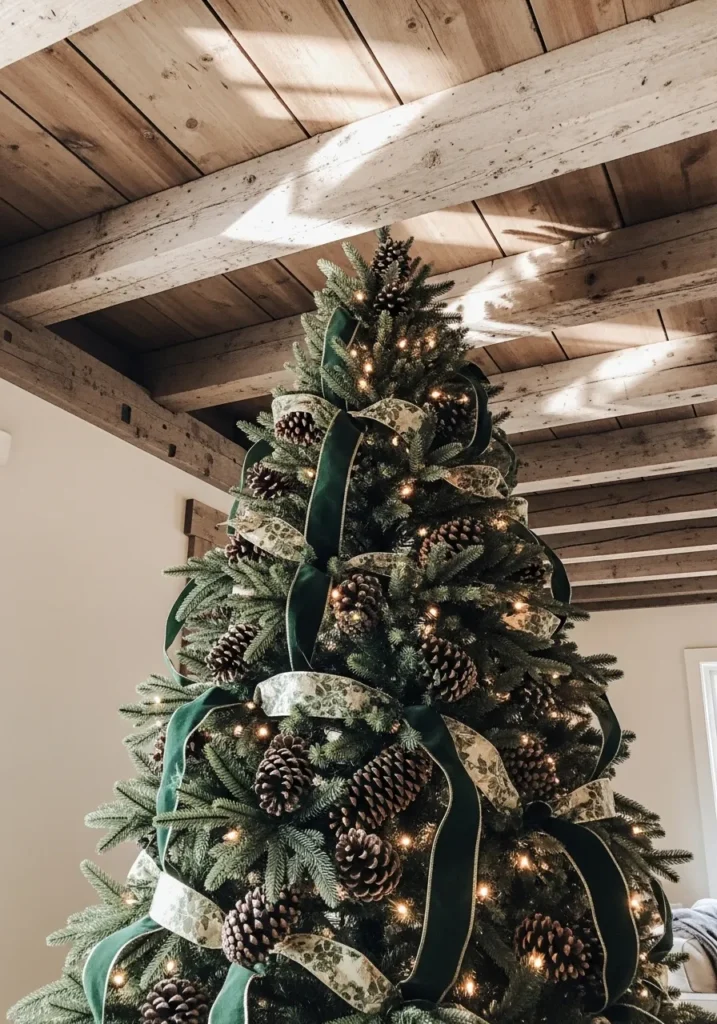 This lush tree wrapped in deep green velvet ribbons feels rich yet grounded. The mix of pinecones and soft golden lights creates a warm and natural glow under those rustic wooden beams. It’s elegant but still has that down-to-earth charm that makes you want to curl up nearby.