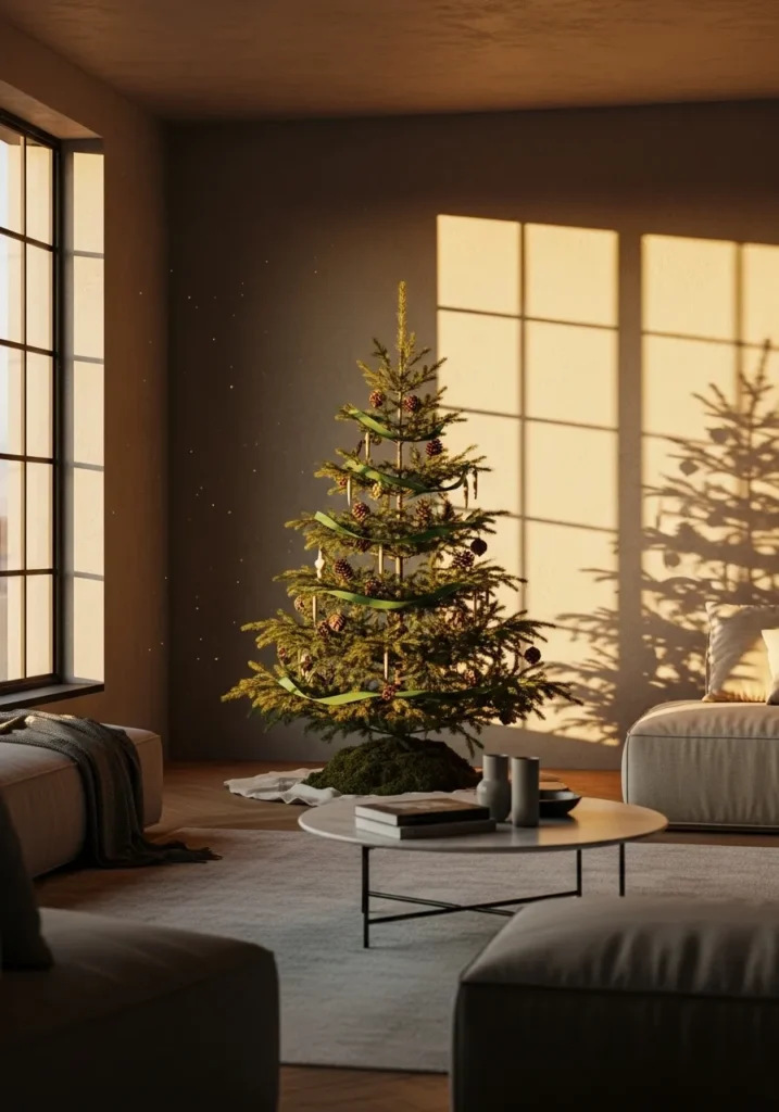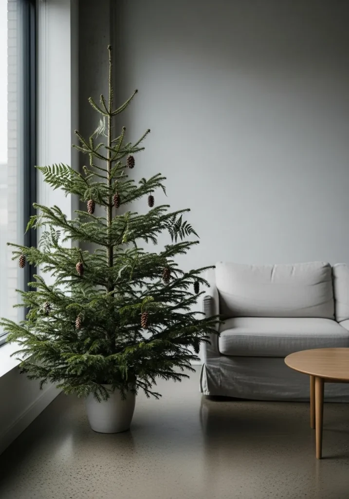 This potted evergreen fits perfectly in a sleek, minimalist space. Adorned only with pinecones, it makes a quiet statement that proves natural beauty doesn’t need much help. The gray walls and clean lines let the soft greens shine effortlessly.