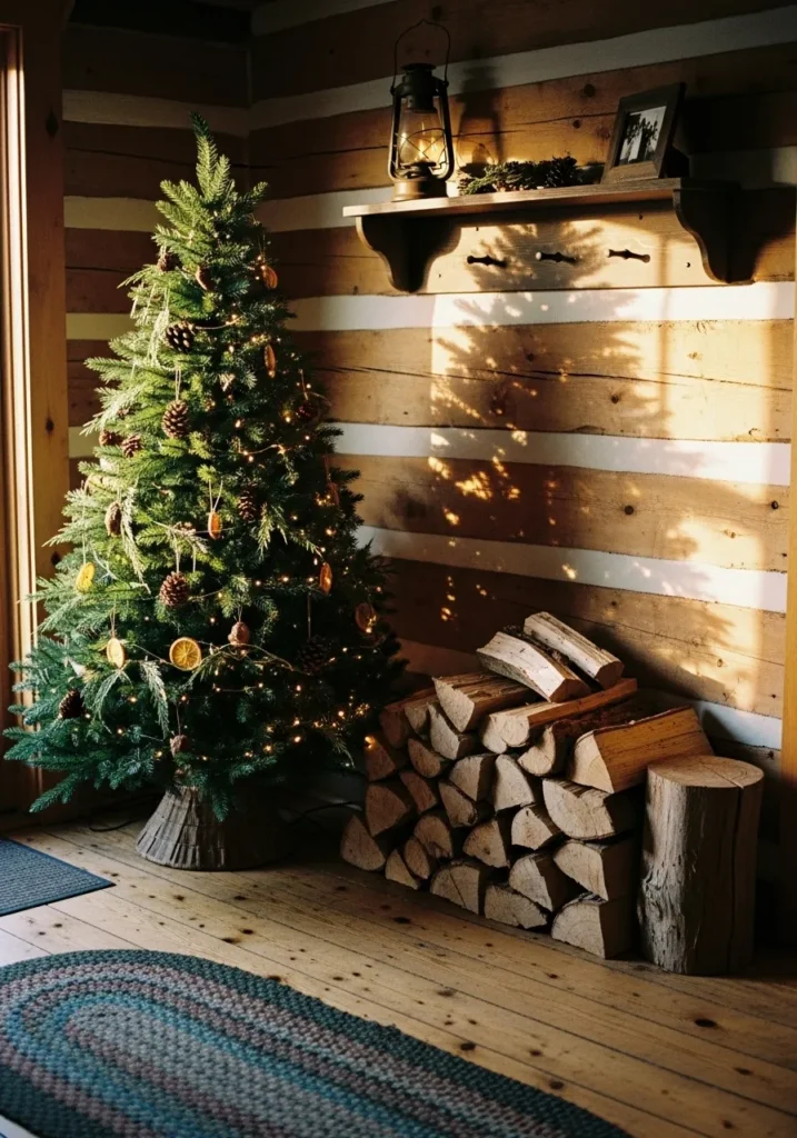 Set against a backdrop of wood walls and a neat stack of firewood, this Christmas tree glows with pinecones, orange slices, and dainty fairy lights. The natural wood tones and warm sunlight make it feel straight out of a cozy mountain hideaway.