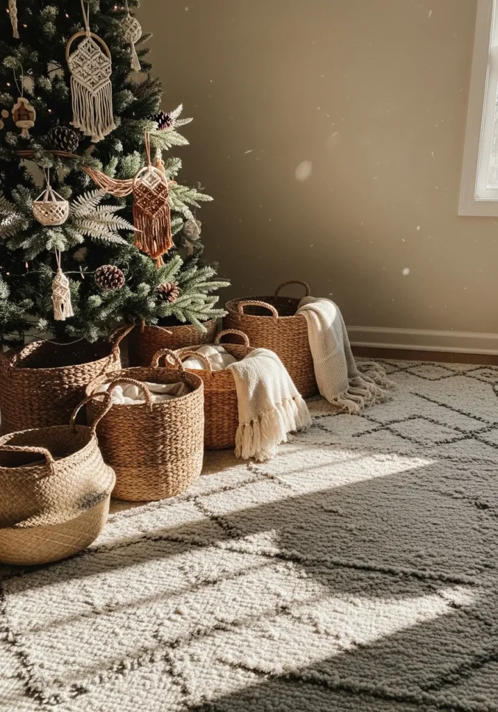 This tree takes on a soft bohemian look with its macramé ornaments and warm earthy tones. The woven baskets filled with throws and gifts below tie everything together, creating a natural and stylish vibe.