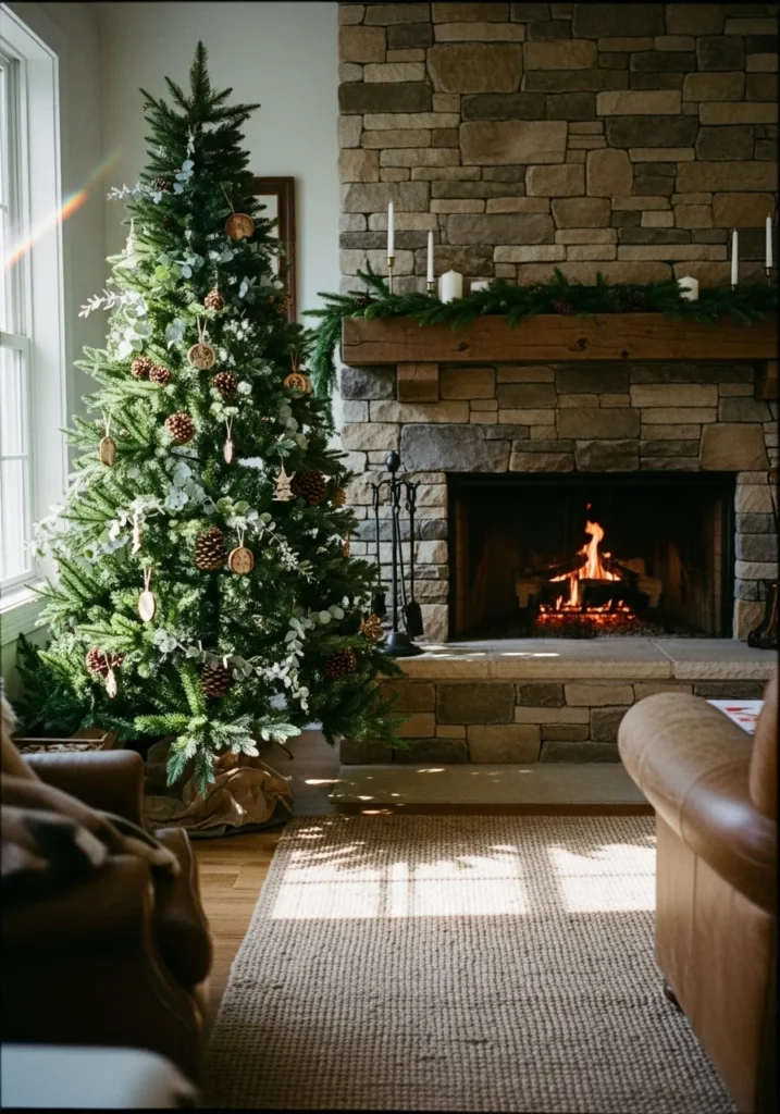 This Christmas tree glows beside a classic stone fireplace, decorated with pinecones, wooden ornaments, and eucalyptus sprigs. The matching greenery along the mantel brings harmony to the space, tying nature and holiday charm together.