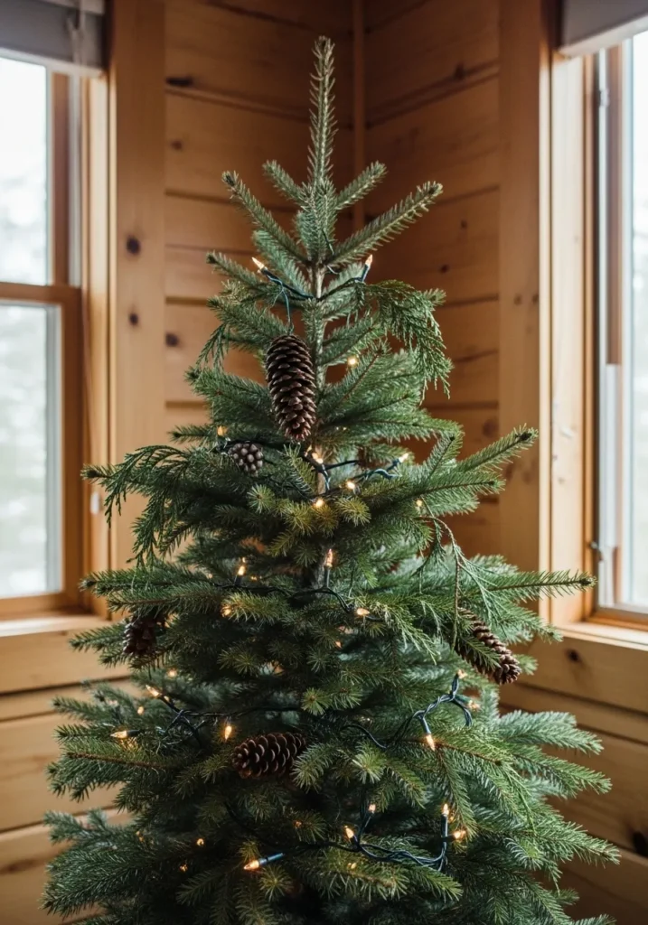Set against a backdrop of honey-toned wood, this pinecone-covered tree glows softly with string lights. It’s small enough to fit perfectly in a cozy cabin corner but full of charm thanks to its simplicity. Every pine needle looks like it was plucked straight from a forest walk.