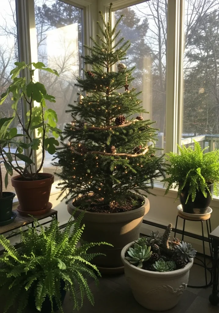 A small potted Christmas tree surrounded by lush green houseplants creates the dreamiest nature-inspired nook. The tree is trimmed with pinecones and tiny lights, glowing softly in the afternoon sun. It’s like a mini indoor garden celebrating the season.
