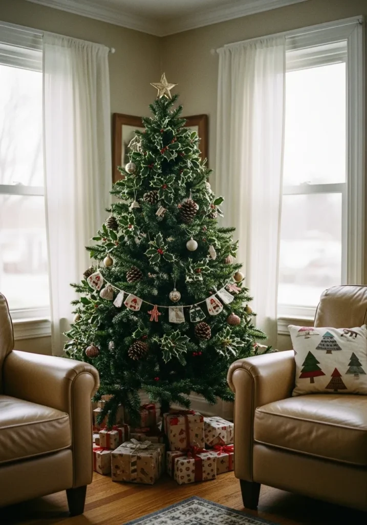 This tree blends the charm of traditional holiday decor with a nature-inspired twist. Pinecones, holly, and neutral ornaments come together beautifully, while the surrounding leather chairs and soft curtains give the room a timeless coziness.