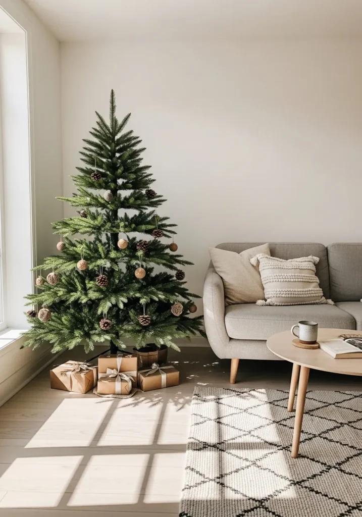 This Christmas tree keeps things effortlessly simple with pinecones, woven ornaments, and soft brown gift wrap tucked neatly underneath. The natural light streaming through the window makes every detail feel warm and intentional. The neutral tones of the rug and sofa balance the fresh greenery perfectly, creating a calm and inviting corner.