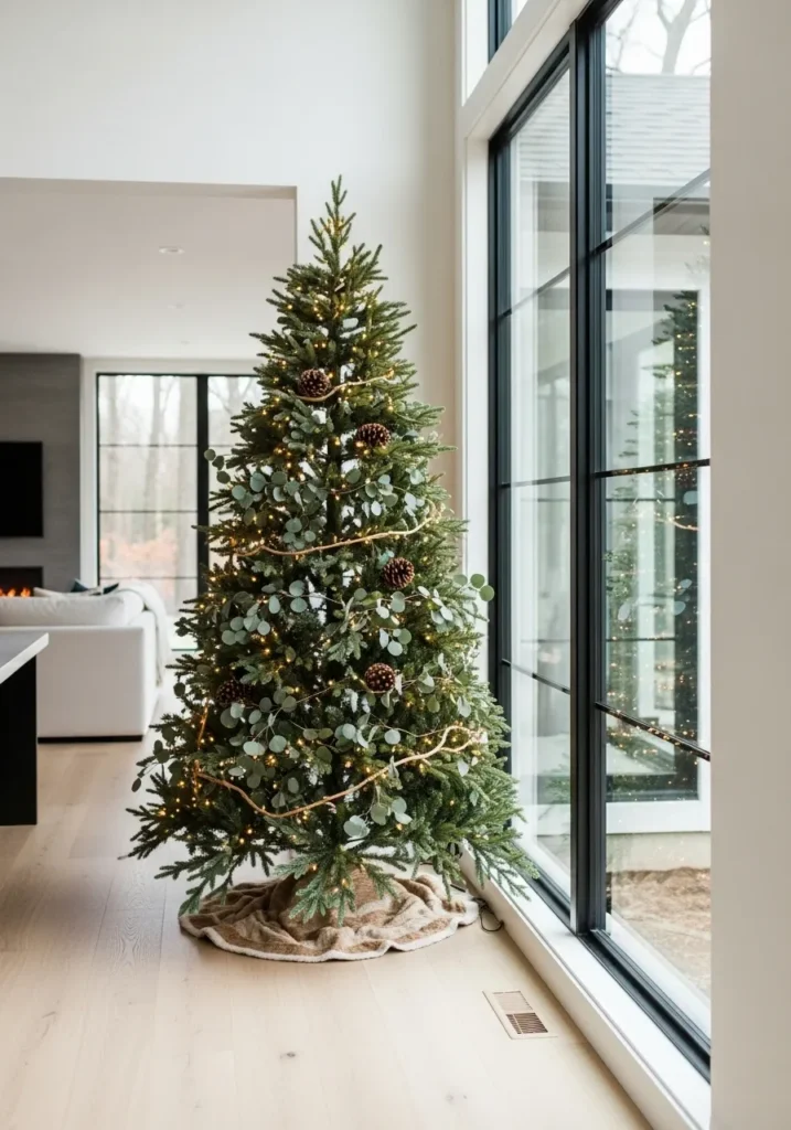 This elegant tree is dressed with pinecones, twinkling fairy lights, and sprigs of eucalyptus that add a modern botanical twist. The floor-to-ceiling windows let the natural light bounce off the greenery, giving it an airy, fresh feel that feels like winter sophistication done right.