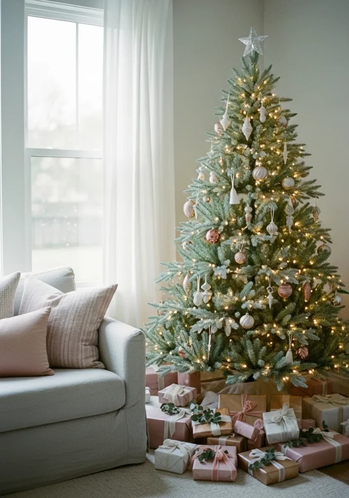 This soft-toned living room feels like a warm hug wrapped in blush and cream. The pastel ornaments shimmer against the frosted branches, while the neatly wrapped pink and beige presents underneath complete the cozy look. The light streaming through the sheer curtains makes everything glow just a little more softly, almost like a dreamy winter morning.
