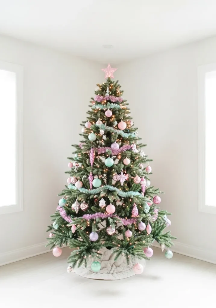 If your heart belongs to traditional green trees but you still want a pastel twist, this one’s perfection. The pale pink, mint, and lilac ornaments pop beautifully against the evergreen branches, while the sparkly tinsel adds a playful touch. It’s cheerful without being over the top.