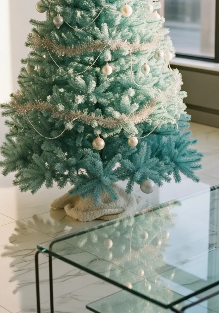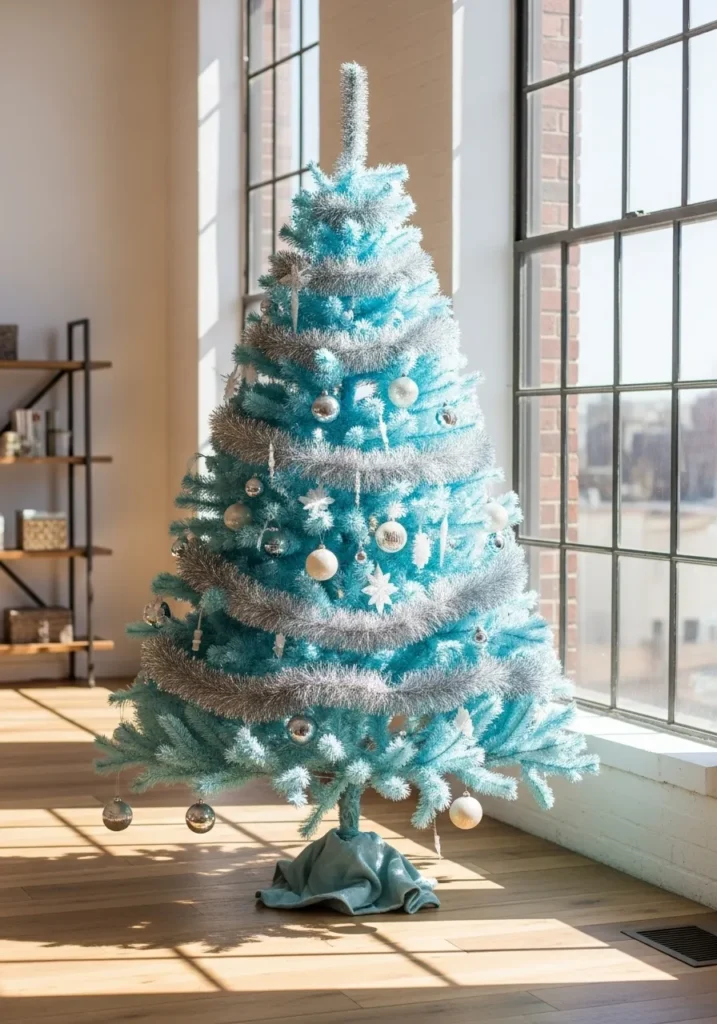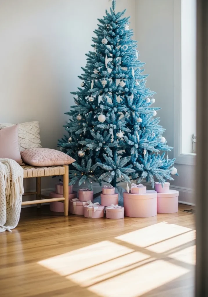 This icy blue Christmas tree stands tall and graceful, surrounded by soft pink gifts and neutral accents. The silver ornaments shimmer just enough to add sparkle without stealing attention. Sunlight streaming in gives the whole setup a serene winter glow.