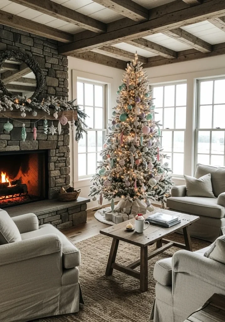 There’s a cozy, storybook feeling in this rustic living room. The pastel ornaments on the frosted tree blend perfectly with the stone fireplace and wooden beams, creating the dreamiest mix of warmth and color. It’s a pastel wonderland with a cozy cabin soul.