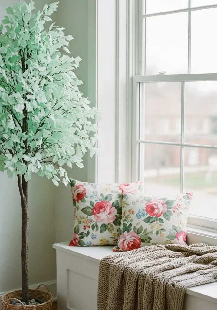 This mint-green decorative tree adds a playful pop to the window nook. The floral pillows tie the color story together, creating a sweet, vintage vibe that feels light and happy. It’s a charming corner that invites you to sit, sip cocoa, and admire the view.