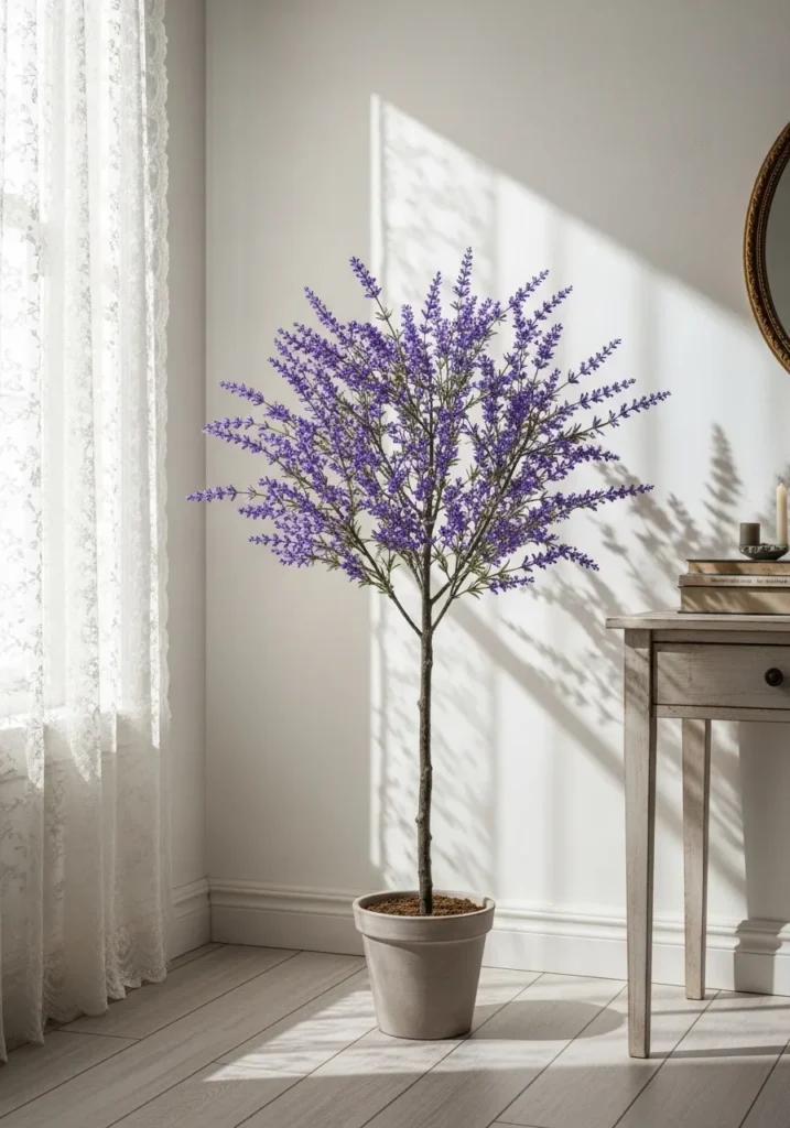 This delicate lavender tree adds a peaceful touch to the corner of the room. The soft purple blooms contrast beautifully with the white lace curtains, and the morning sunlight makes the petals almost shimmer. It’s subtle, elegant, and perfectly balanced with the vintage-style furniture beside it.
