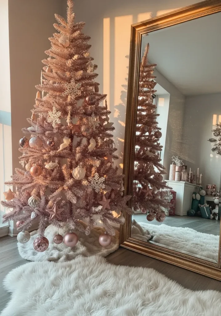 This blush-toned Christmas tree glows beautifully in the sunset light, with rose gold ornaments and soft white details reflecting gently in the large mirror beside it. The fluffy rug adds extra coziness, creating a picture-perfect pastel nook that feels modern yet dreamy.