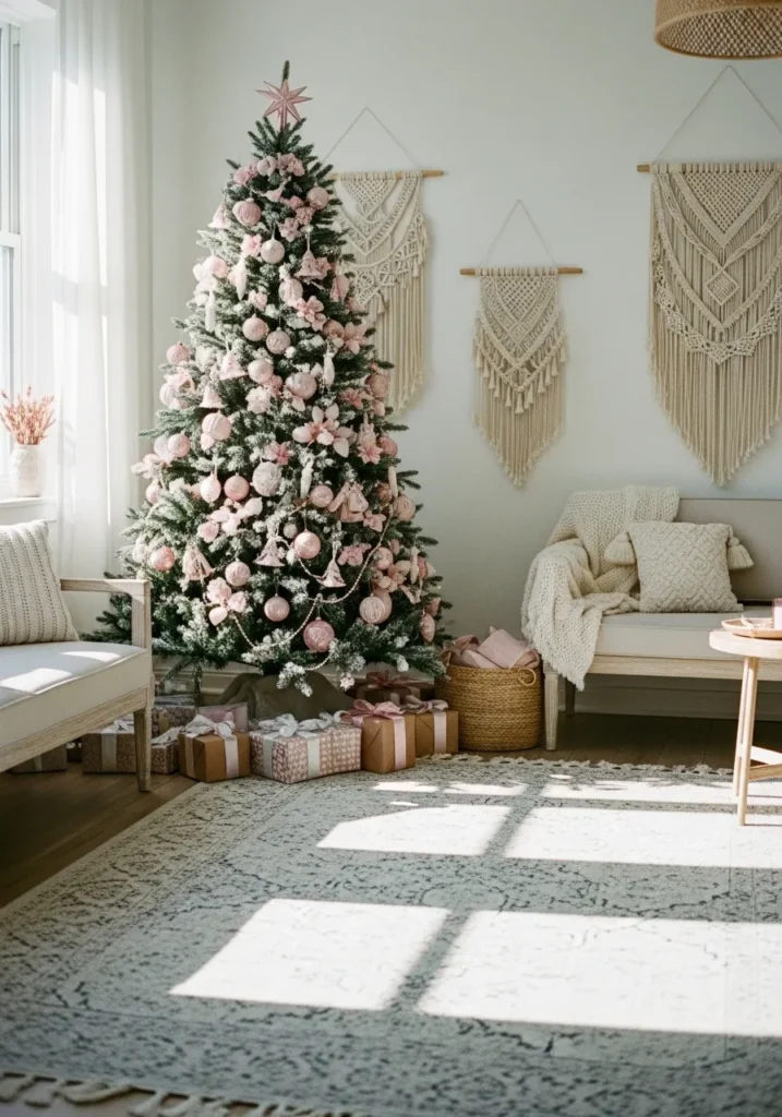Here’s a pastel tree that perfectly blends boho charm with holiday sweetness. The mix of blush ornaments, macrame wall art, and woven textures makes the space feel calm and welcoming. The soft pinks and creams pair effortlessly with the natural tones of the room.