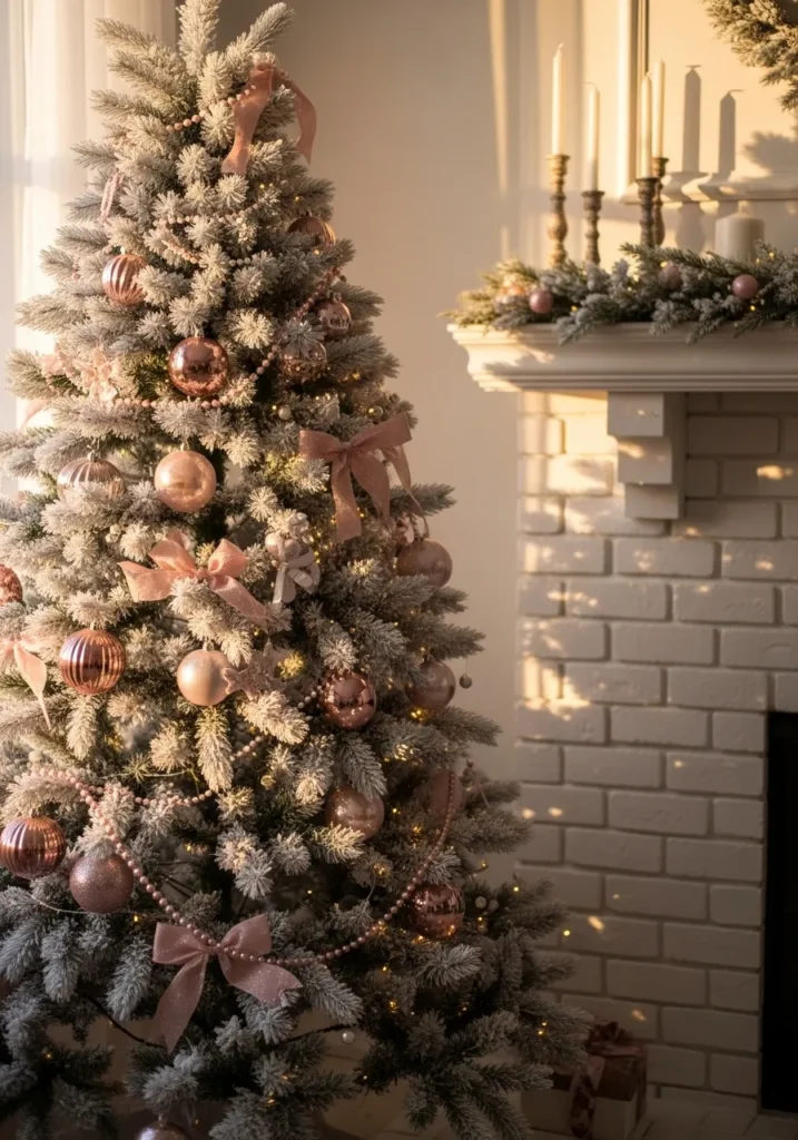 This rose-gold themed Christmas tree feels like it stepped right out of a fairytale. The soft metallic ornaments, velvet bows, and the warm evening light dancing across the fireplace create the perfect rosy glow. Everything feels intentional yet natural, like it was made for golden hour.