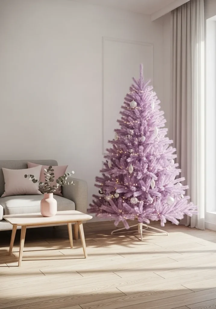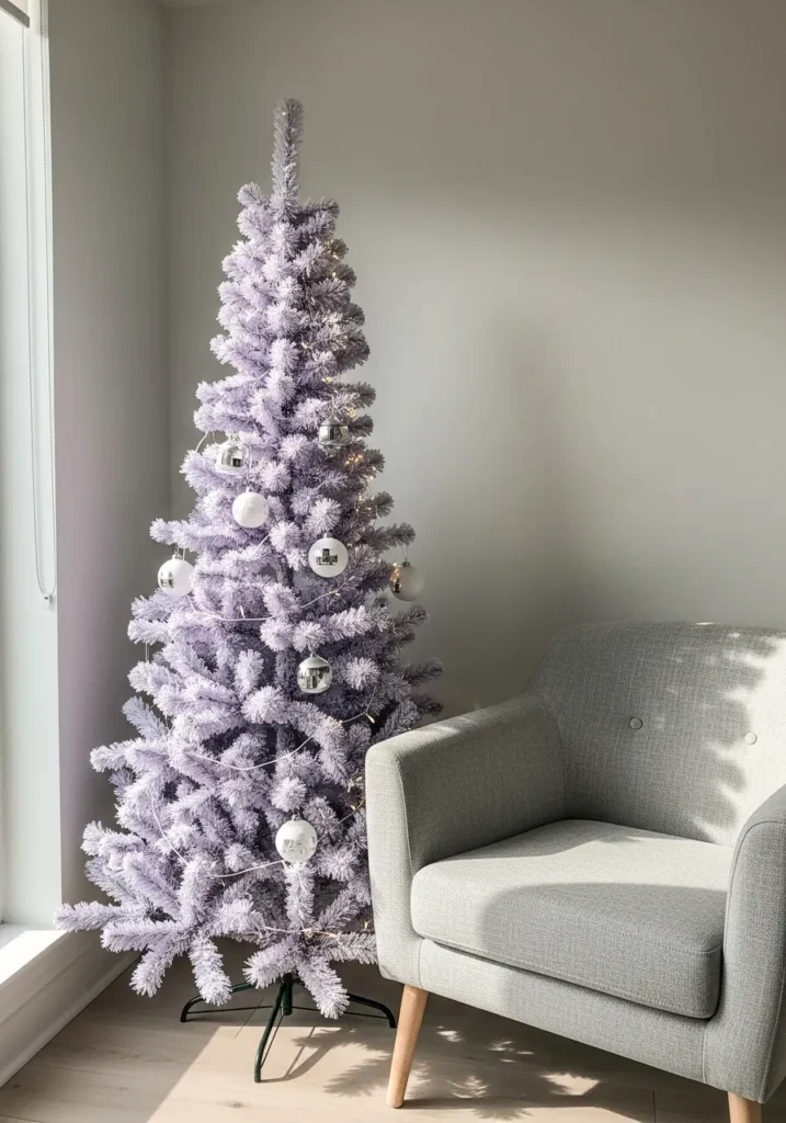 There’s something quietly elegant about this lavender tree. The soft purple hue paired with minimal silver and white ornaments keeps the look fresh and modern. The sunlight pouring in adds an extra glow, turning a simple setup into something truly soothing.
