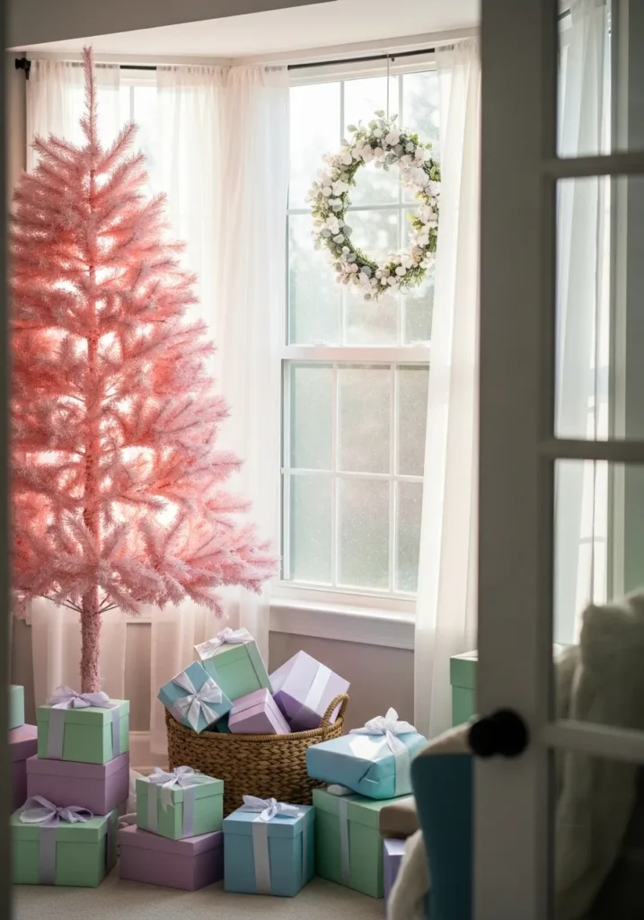 A soft pink tree glowing in the corner, surrounded by pastel-wrapped gifts—it doesn’t get dreamier than this. The mint, lilac, and soft blue boxes tie everything together, making it look like a sugar-coated wonderland. The white curtains and floral wreath add a touch of winter romance.