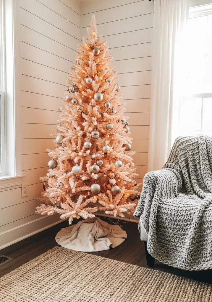 This peach-toned Christmas tree radiates warmth from top to bottom. The soft coral hue of the branches paired with glimmering silver ornaments makes the entire space feel golden. A chunky knit throw nearby adds just the right amount of cozy texture.