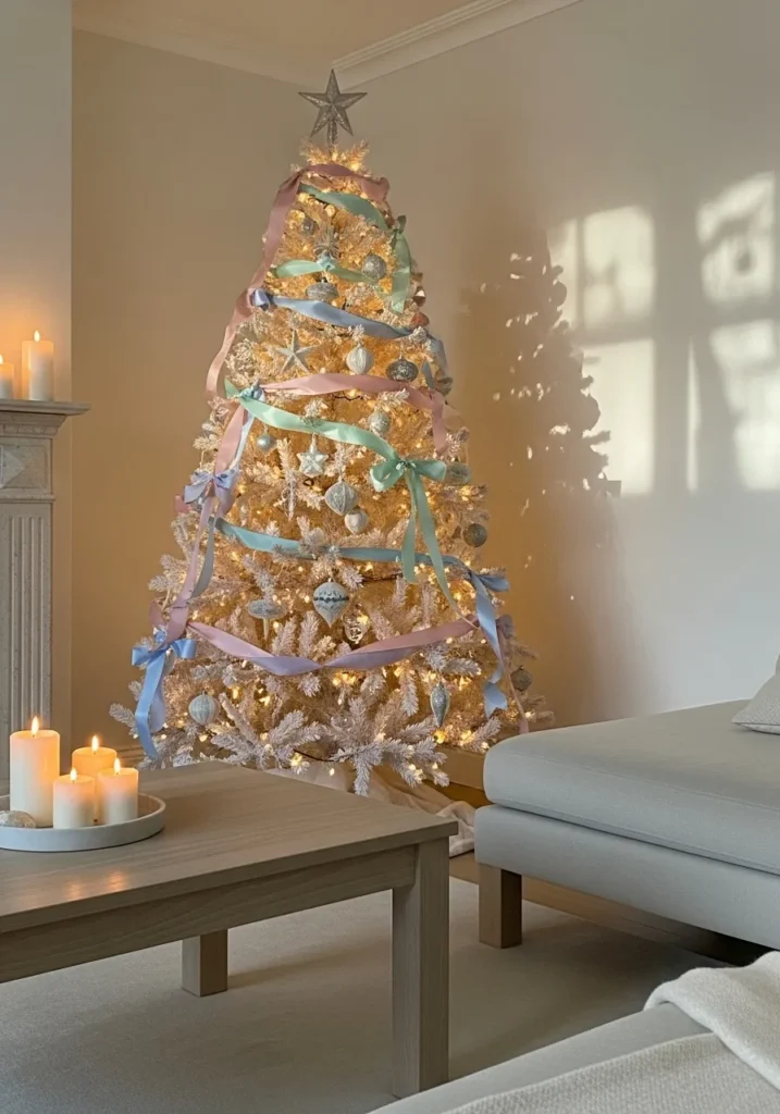 Here’s a tree that feels straight out of a pastel fantasy. Soft ribbons in pink, blue, and mint swirl around snowy branches, catching the light from delicate fairy bulbs. The silver ornaments shimmer subtly, while the surrounding candles add warmth and softness to the room.