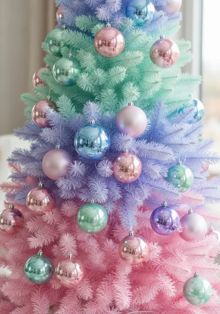 This tree looks like it was dipped in cotton candy dreams. The ombré effect blending from pink to lavender to mint is pure magic, and those glossy pastel ornaments make it sparkle like a sweet holiday confection. It’s the kind of tree that brings instant joy to any room.