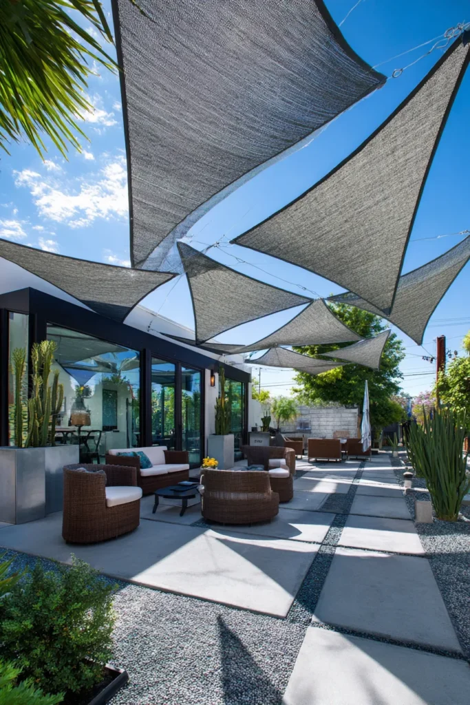 This striking design is all about modern flair and smart sun protection, making it perfect for a sunny, contemporary setting. The ground plane features large, geometric concrete pavers separated by dark river rock, creating a beautiful contrast and texture. The most impressive element is the series of overlapping triangular shade sails in a dark grey fabric, which provide relief from the sun while adding incredible architectural drama above the comfortable, woven wicker seating areas.