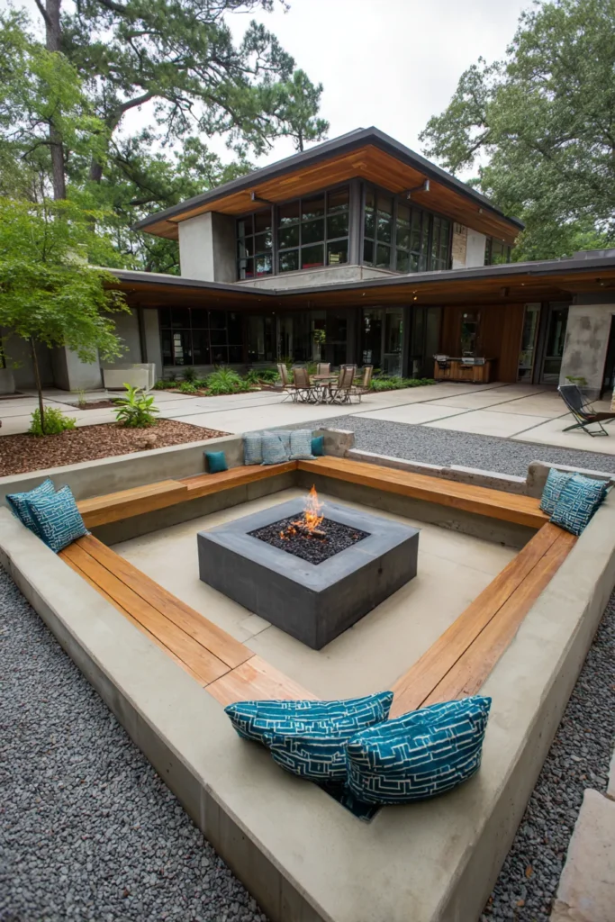 This striking design is a fantastic example of using architecture to create a cozy and defined outdoor gathering space. The patio features a dramatic sunken fire pit area, framed by built-in concrete benches topped with warm wooden planks for comfortable seating. The entire area is set on a base of mixed paving and dark gravel, which contrasts beautifully with the clean, light concrete walls and the vibrant turquoise cushions that add a perfect pop of color.