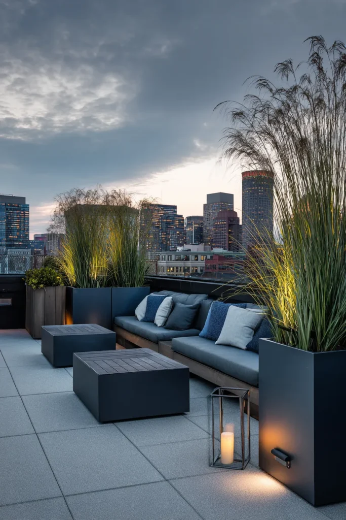 This incredible rooftop patio proves that high-rise living can come with amazing outdoor luxury and tranquility. The space is grounded by large, light grey pavers and framed by the dramatic city skyline, which is especially stunning as the sun sets. Sleek, dark-toned planters house tall ornamental grasses, which serve as beautiful, organic privacy screens, while the comfortable built-in seating is perfect for enjoying the view and the warm glow of the modern accent lighting.