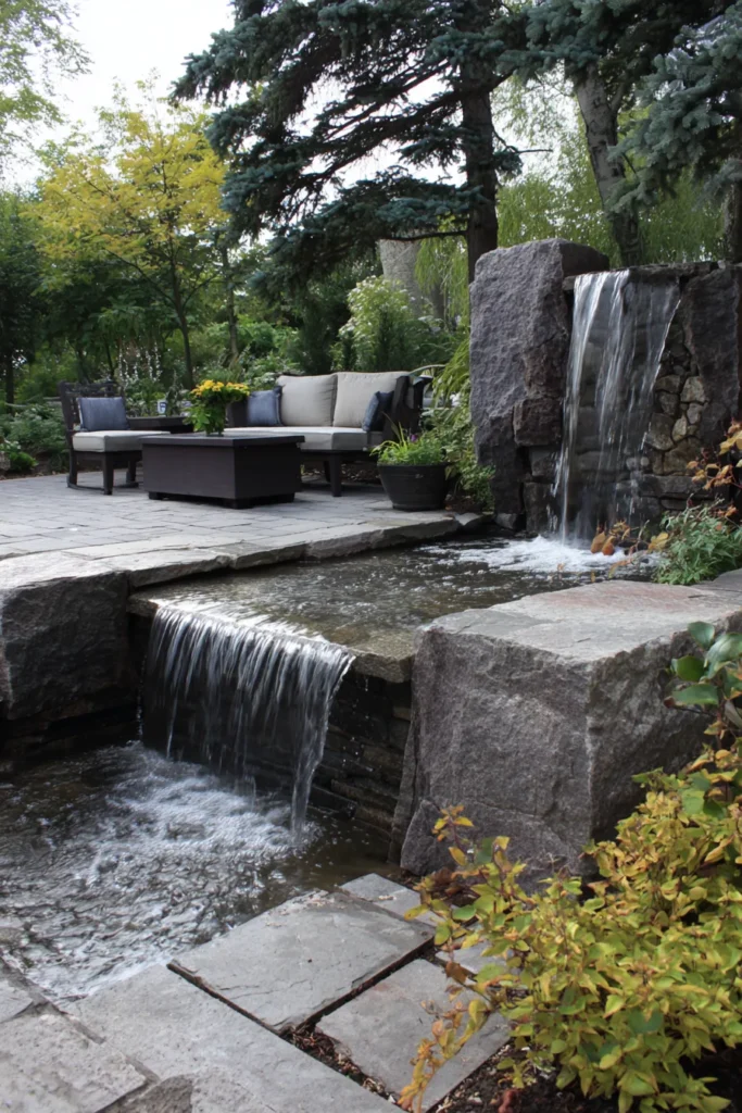 I think this kind of design is just so peaceful and meditative—it’s like having a miniature mountain stream right in your backyard! The sheer size of those stone slabs gives the waterfall a really dramatic, natural presence that feels authentic and incredibly impressive. It’s the ideal spot for escaping the daily grind, where you can sip your tea and listen to the water, feeling completely refreshed and connected to nature.