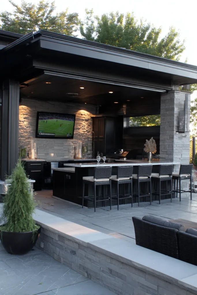 Honestly, this setup is pure decadence—it’s like having a chic sports bar and a gourmet kitchen all rolled into one amazing outdoor pavilion. I absolutely adore the contrast between the dark, modern elements and the rough texture of the stone, which keeps it from feeling too cold. It’s such a brilliant, year-round design that makes hosting large groups completely effortless and incredibly stylish, perfect for watching the big game or just enjoying a drink.
