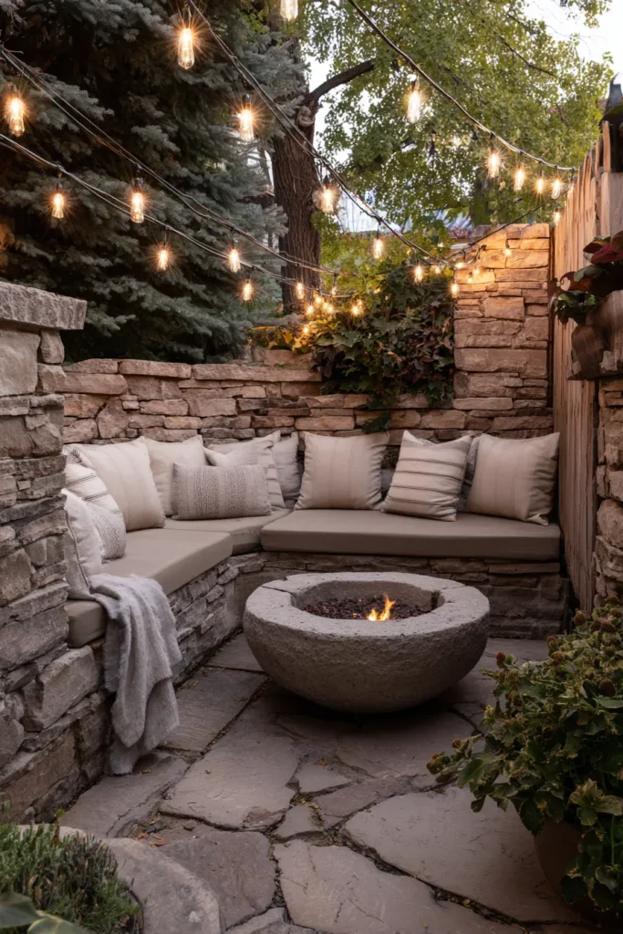 This charming little patio is the perfect example of how to create a super cozy and intimate outdoor room with tons of character. It’s enclosed by beautiful stacked stone walls, giving it a warm, rustic feel that also provides privacy. The space maximizes seating with a built-in L-shaped bench, cushioned in a neutral beige and piled high with plush throw pillows. At the center, a striking round stone fire pit creates a welcoming focal point, all beautifully lit by dreamy overhead string lights.