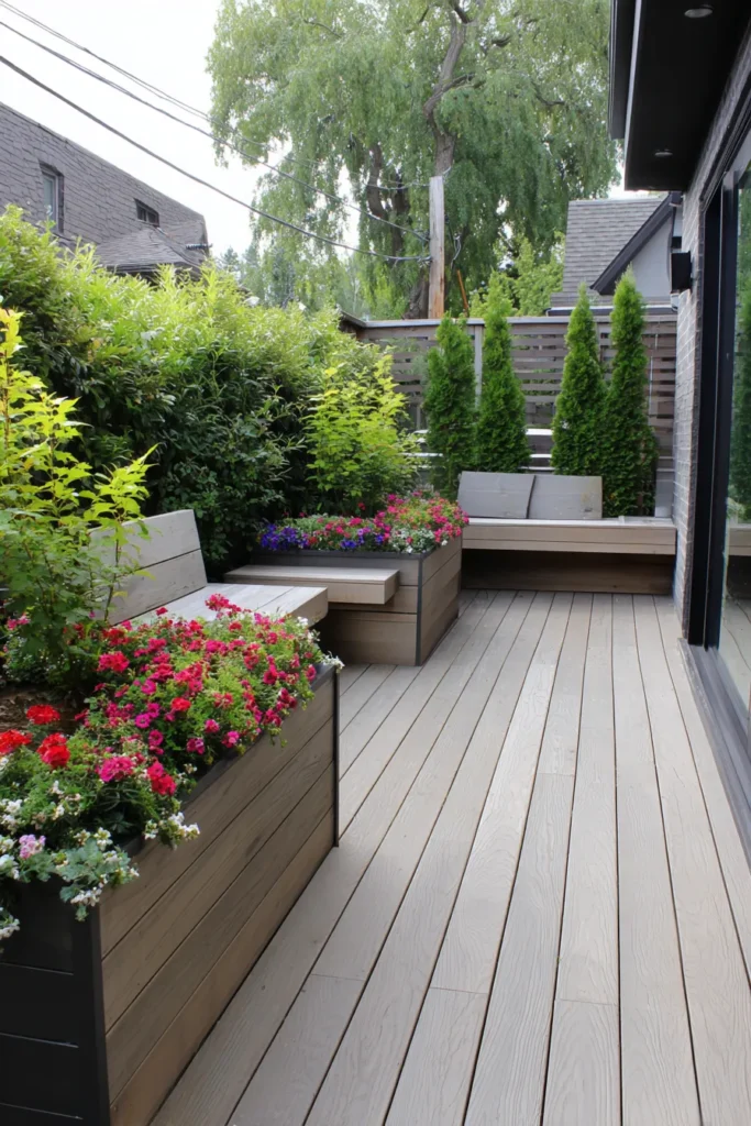 This gorgeous, organized patio is a beautiful example of using clever carpentry to maximize a small- to medium-sized outdoor area. The space features modern, light-toned composite decking which offers a clean, low-maintenance foundation. The star of the show is the multi-level built-in seating, which seamlessly integrates wooden benches with raised planter boxes, creating defined zones filled with vibrant flowering plants and tall, manicured evergreens for privacy.