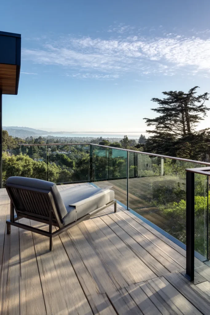 I am completely mesmerized by this view and how the deck design makes it the absolute star of the show! It feels like you’re floating above the treetops, and the glass railing is such a brilliant, modern touch because it lets the scenery pour right into the space. This is my kind of sanctuary—a simple, elegant spot where you can truly relax, soak up the sunshine, and feel completely refreshed by the breathtaking landscape.
