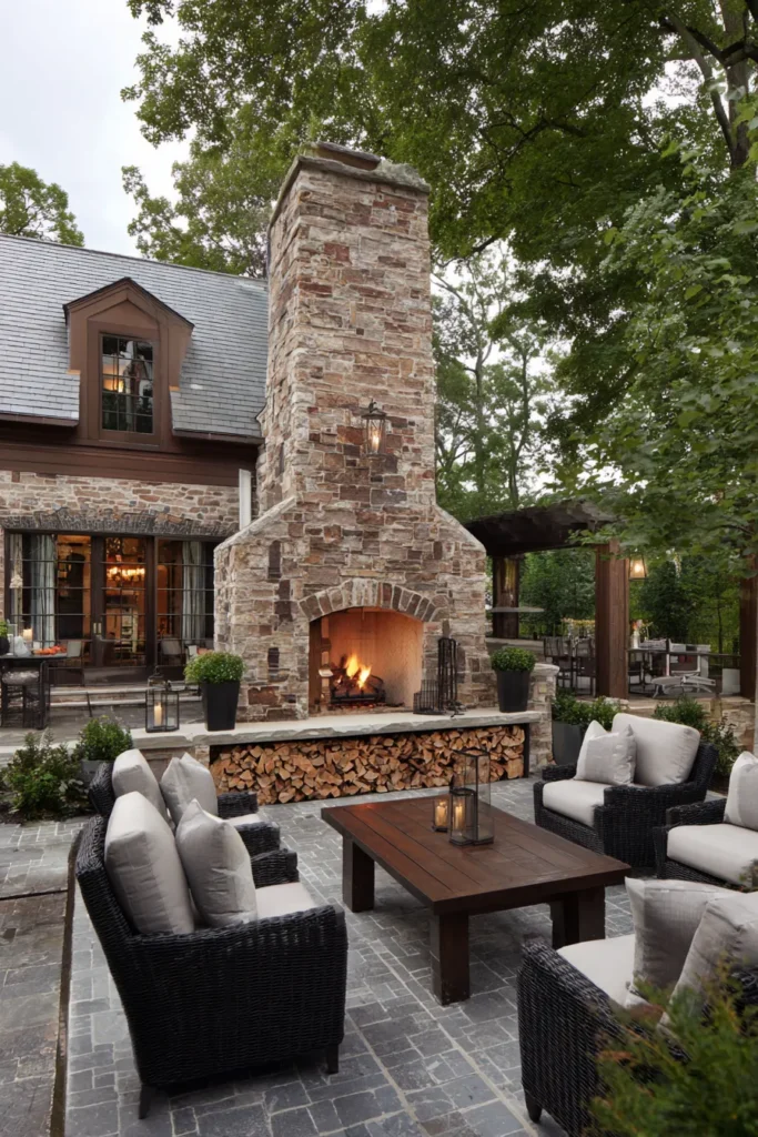 I am completely head-over-heels for the dramatic scale of this fireplace—it makes the entire patio feel like a luxurious, open-air living room that you never want to leave! The combination of the rugged stone and the soft, inviting furniture is just perfect for those crisp autumn evenings. It’s such an incredibly warm and inviting design that gives you that fabulous lodge vacation feeling right at home, making every gathering feel special and snug.