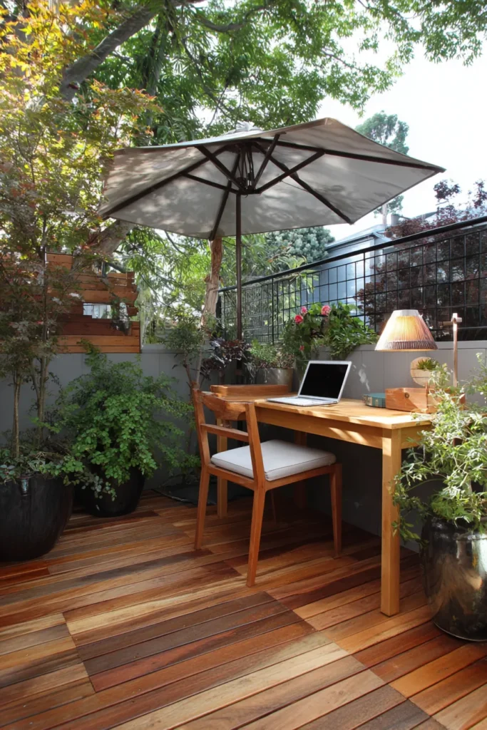 This small space is a brilliant idea for creating a multi-functional urban oasis that feels miles away from the city hustle. It features rich, warm wooden decking that instantly makes the area feel cozy and inviting. A simple, light-toned desk and chair set up a perfect spot for an outdoor office, complete with an umbrella for shade and a charming table lamp, all nestled amongst lush, potted plants.